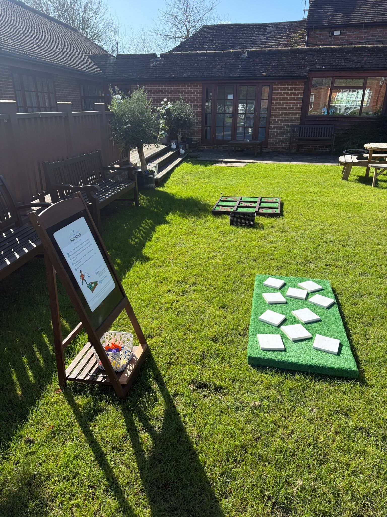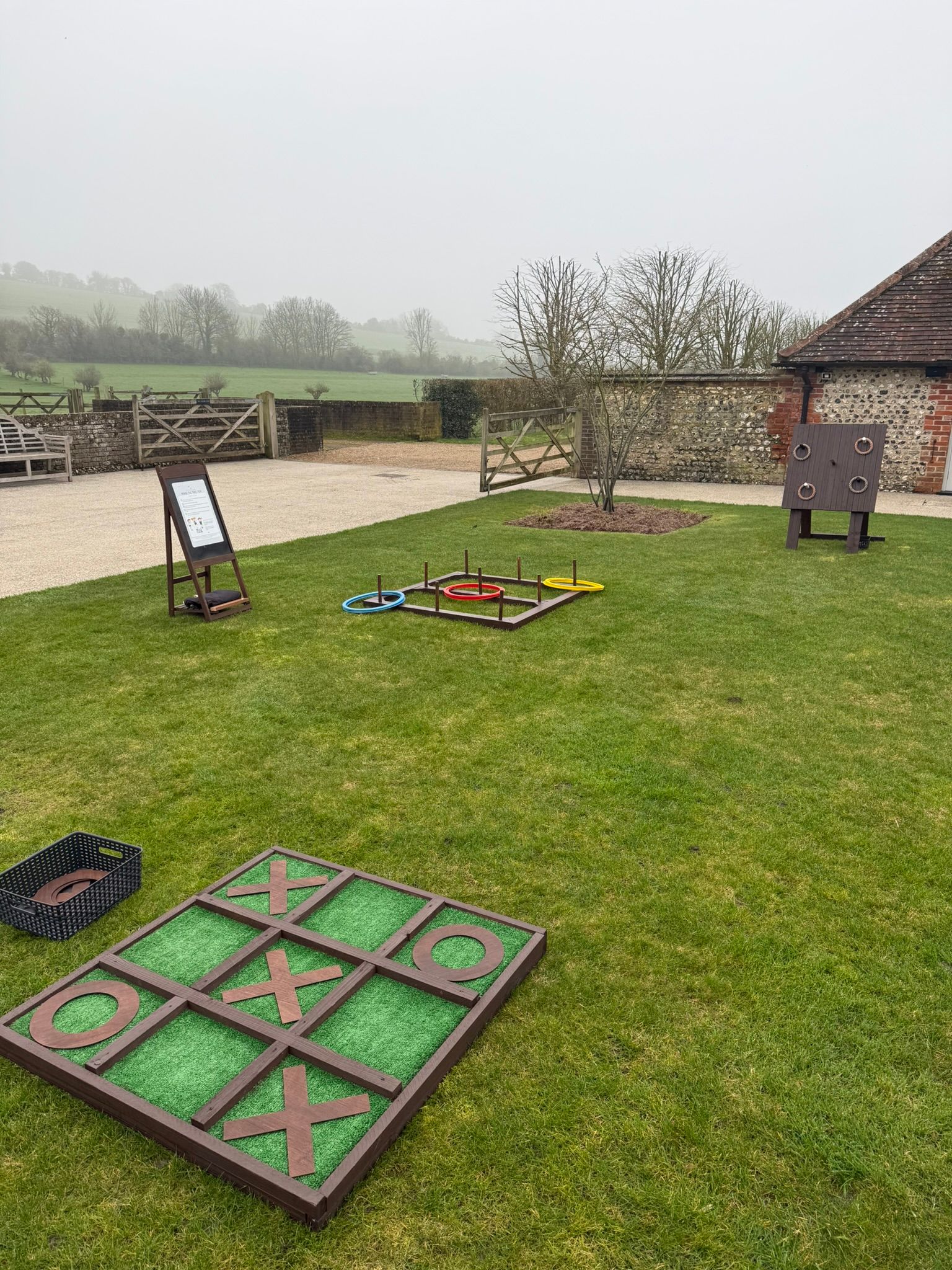 Comes on a wooden playing board that has an astro turf base. We can provide wooden playing pieces or metal ones for when being played indoors or under shelter.